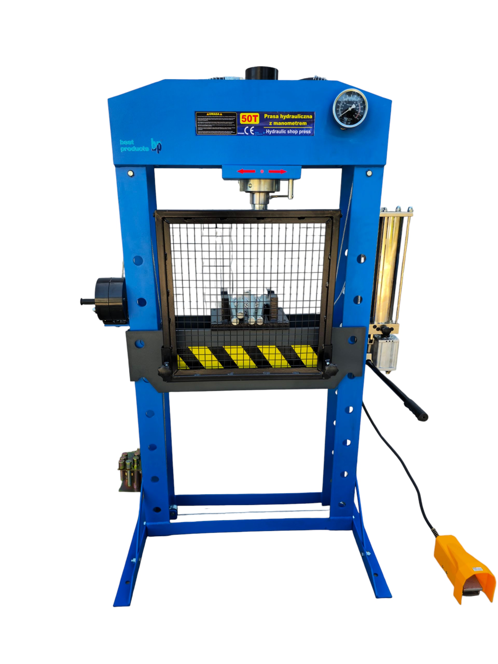 Prasa hydrauliczna BestPro PPH502 o nacisku 50T do warsztatu naprawczego w każdej dziedzinie gospodarki. Konstrukcja prasy jest spawana z przykręcaną podstawą. Wyposażono ją również w kratę ochronną.