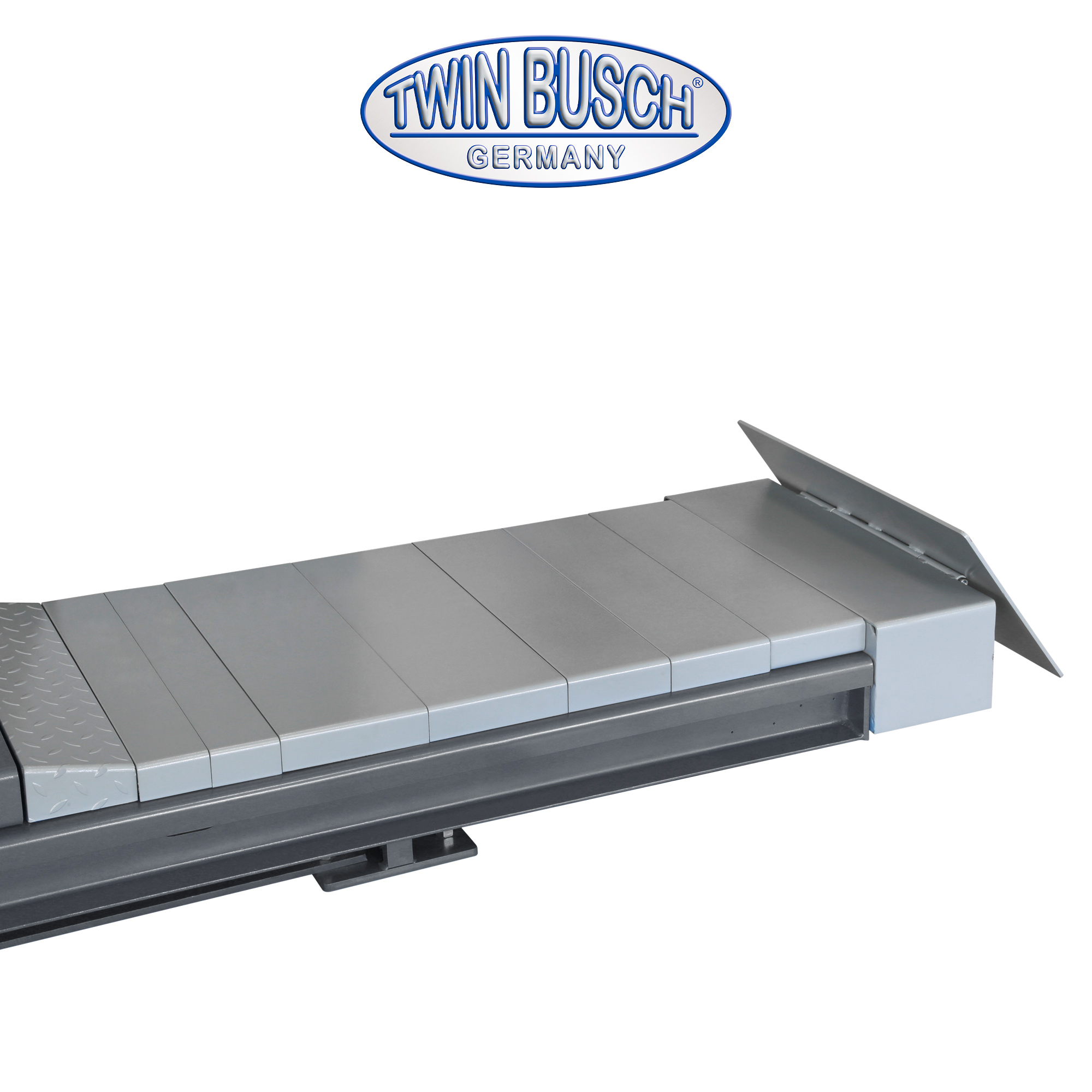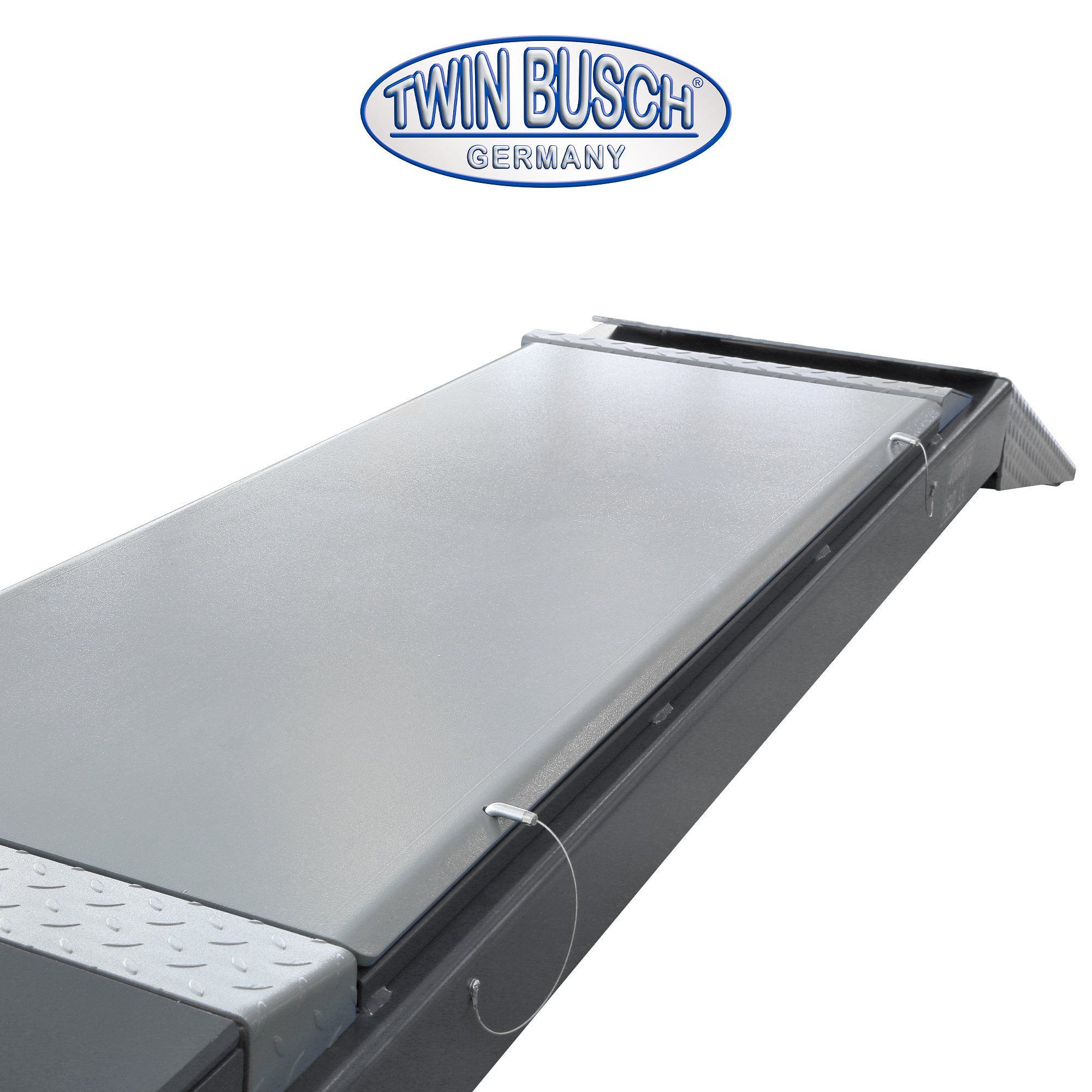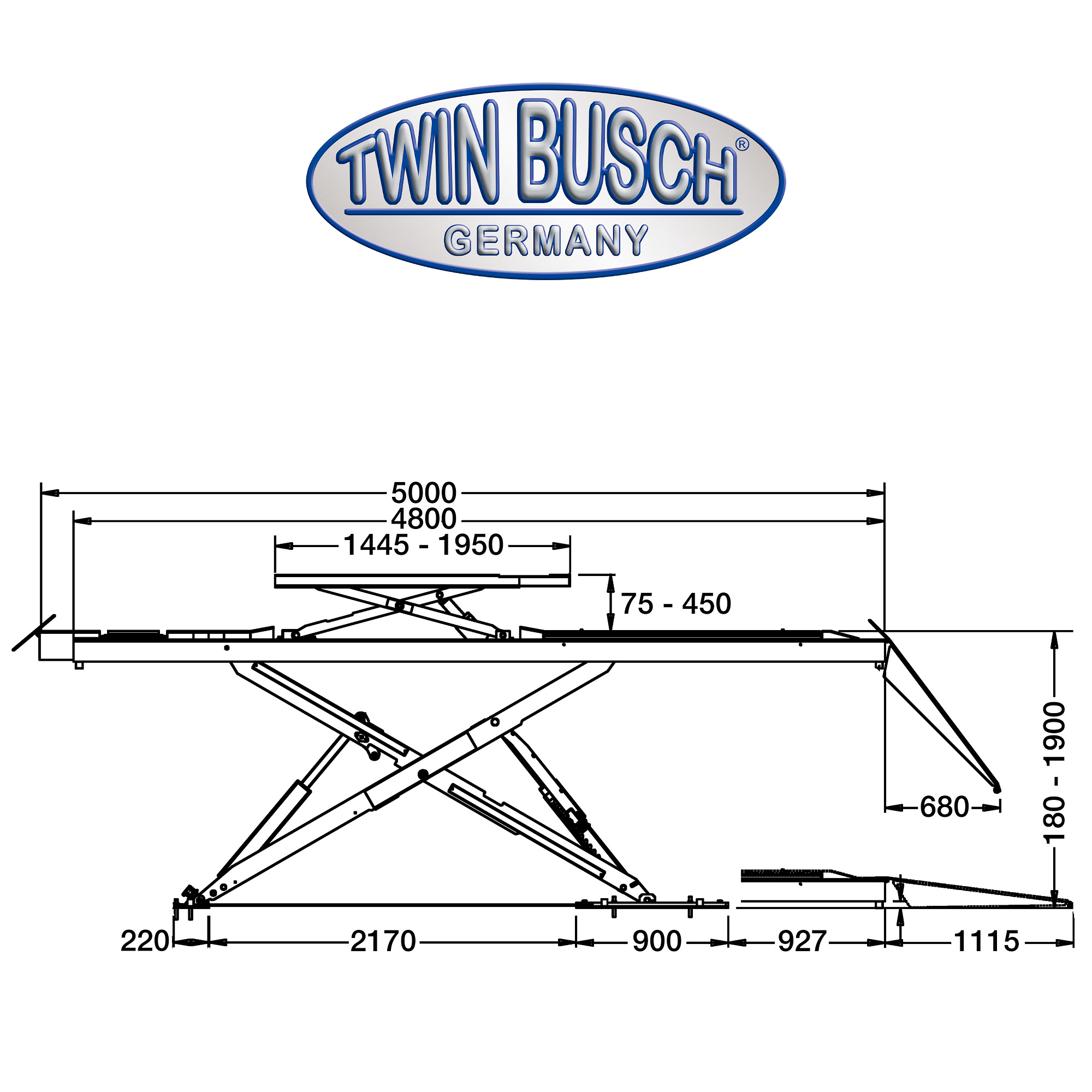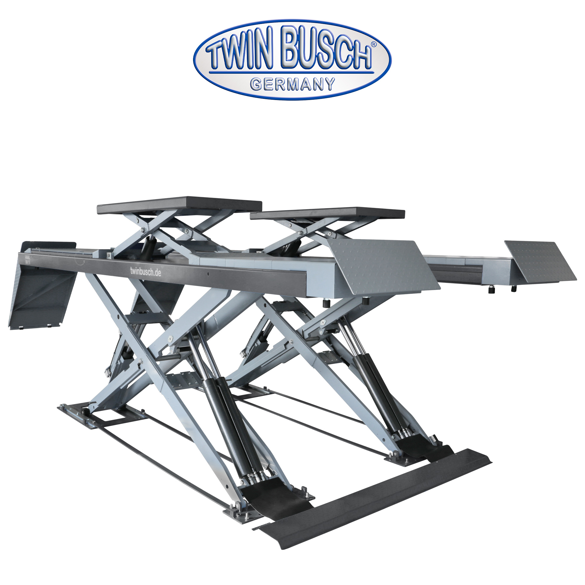 Podnośnik nożycowy diagnostyczny, montowany na posadzce. Ultra płaska konstrukcja (najazd tylko 200 mm) ze zintegrowanym pomocniczym podnośnikiem podprogowym, płytami luzującymi i miejscem na obrotnice. Optymalny do pomiarów i regulacji geometrii kół pojazdu.