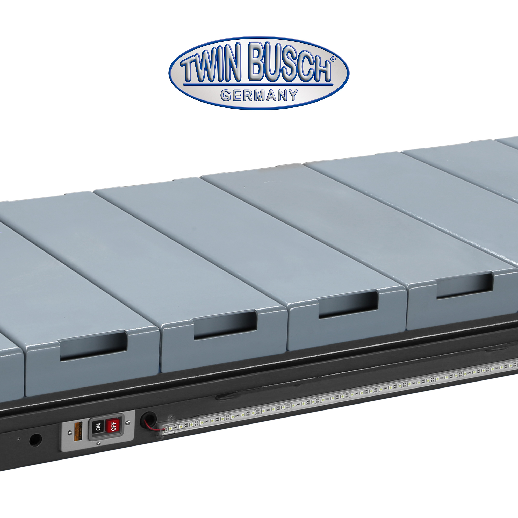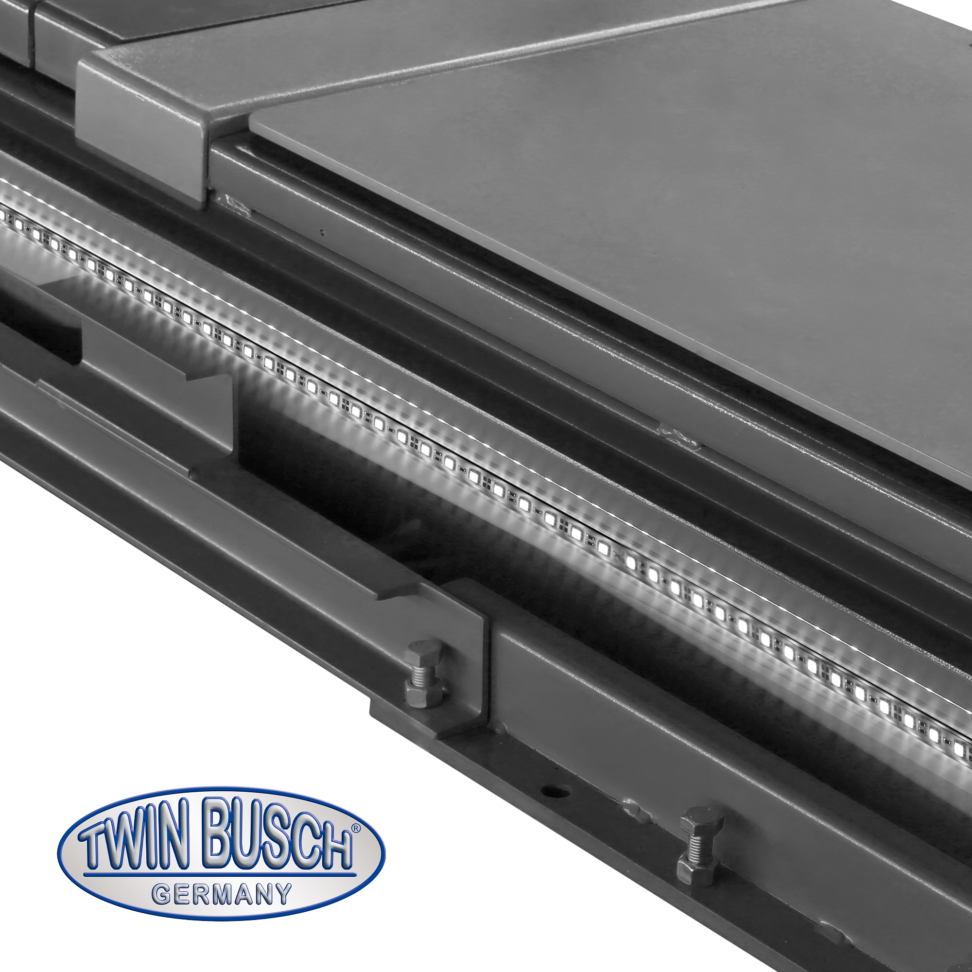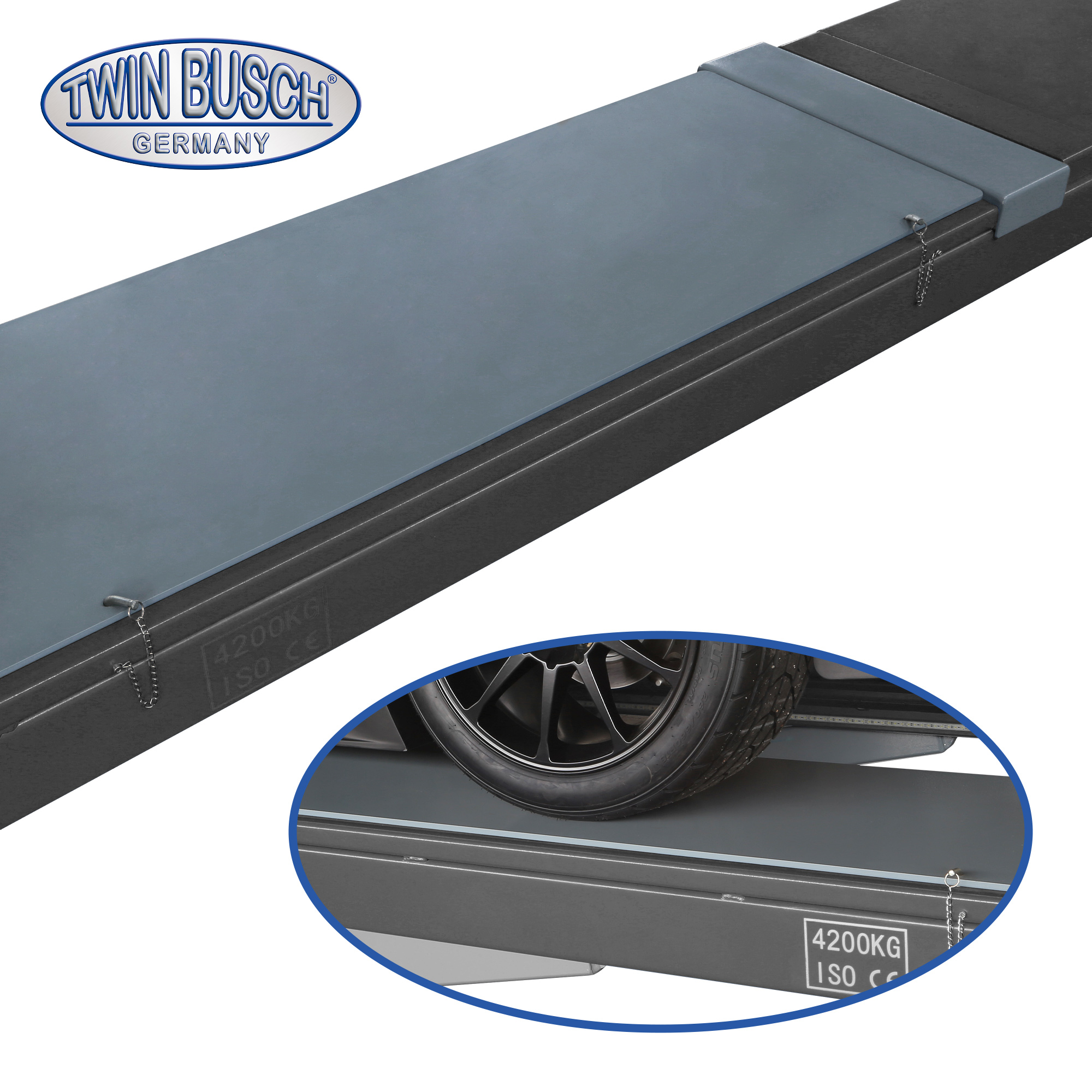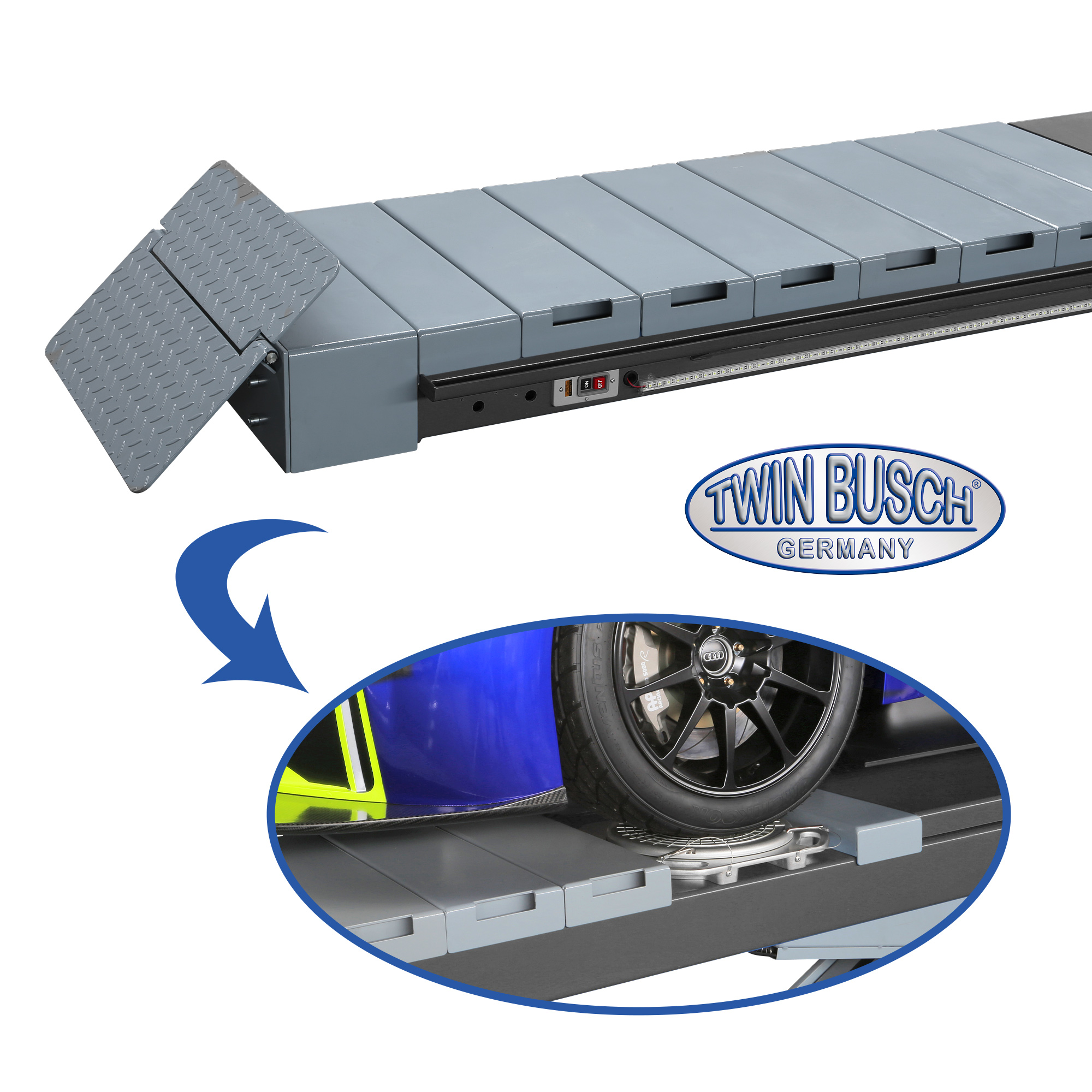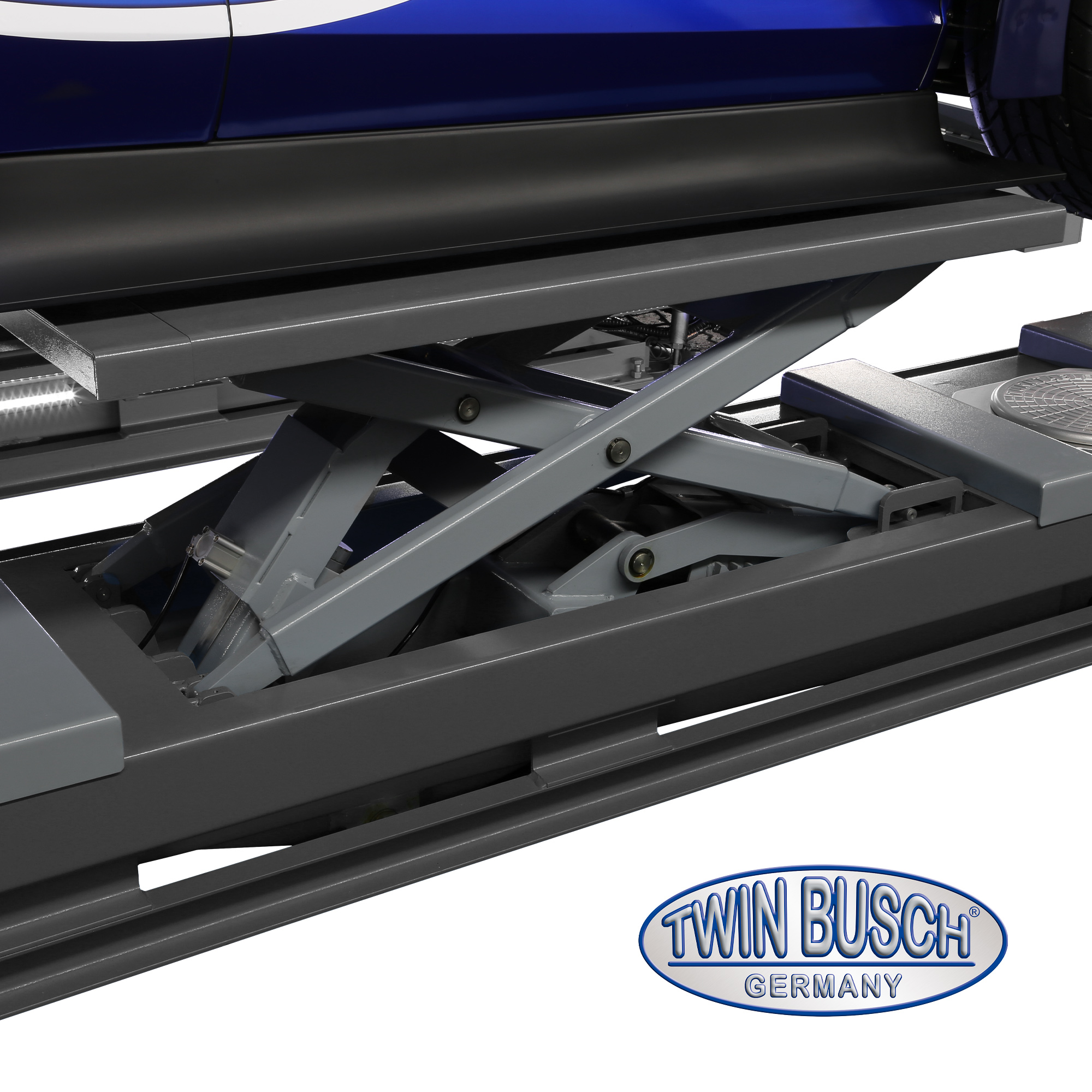 Ten montowany w posadzce podnośnik nożycowy ze zintegrowanym pomocniczym podnośnikiem podprogowym, płytami Rozprężnymi, możliwością zainstalowania podnośnika osi oraz miejscem na obrotnice jest idealny do pomiarów geometrii.