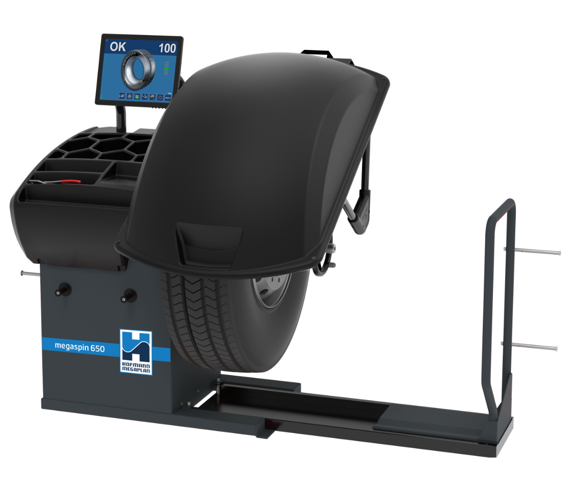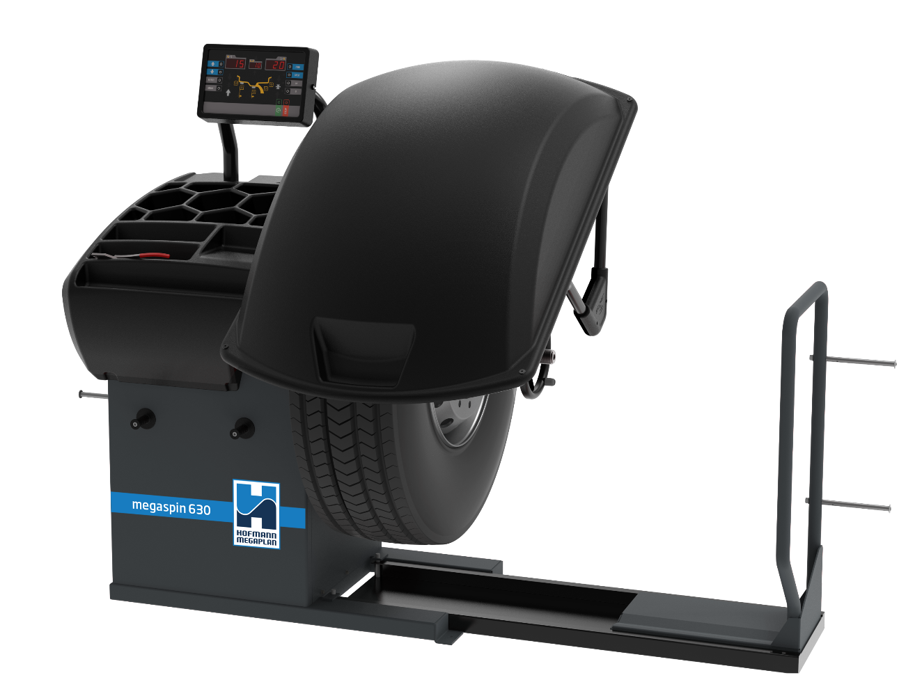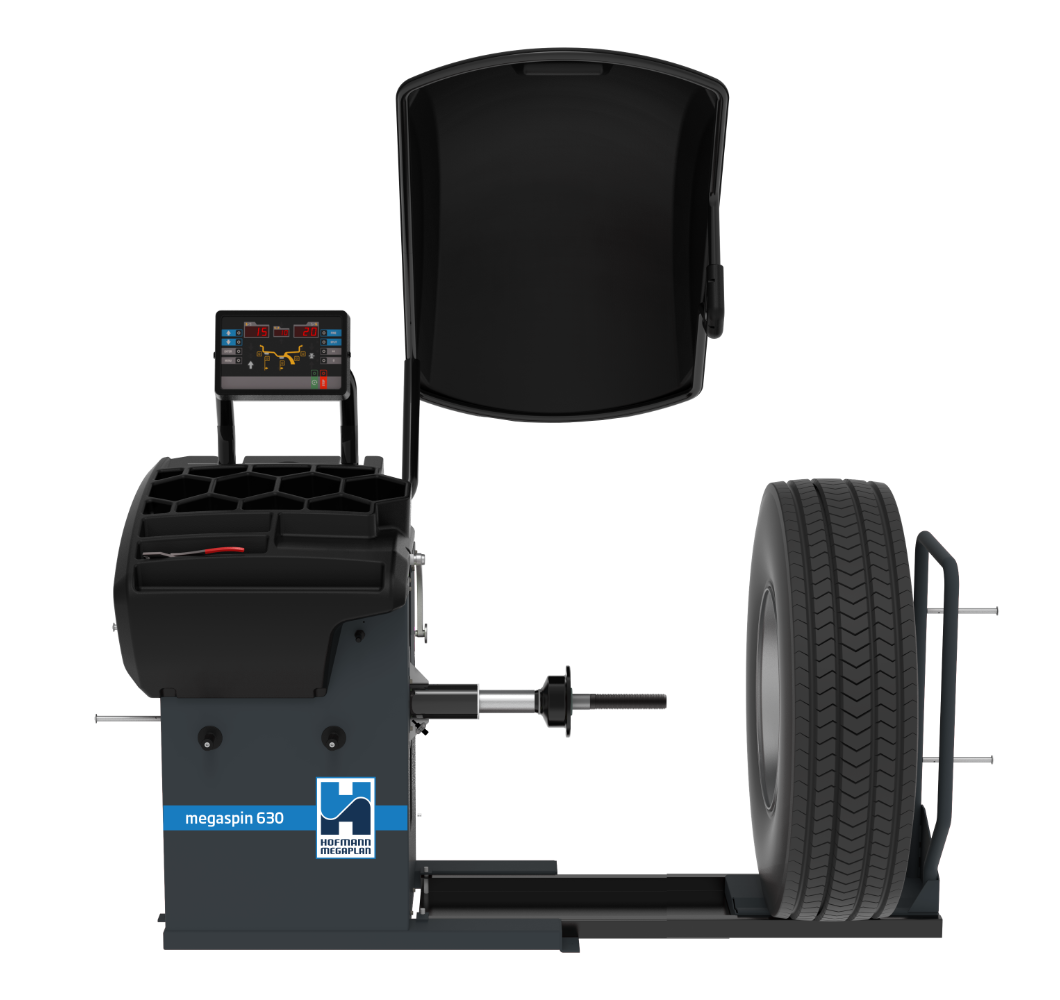 Wyważarka do kół Hofmann MEGASPIN 630 jest nowym cyfrowym urządzeniem do obsługi kół samochodów ciężarowych, dostawczych i osobowych nie cięższych niż 200 kg. Innowacyjne rozwiązanie z opuszczanym wałem (zamiast podnoszenia koła) gwarantuje bezpieczniejsze i łatwiejsze centrowanie ciężkich kół. Ruchomy wózek ułatwia dosunięcie felgi do uchwytu. Nowoczesny i atrakcyjny design z wytrzymałą tacą na ciężarki, poprawioną optymalizacją przestrzeni roboczej i szerokim zakresem dostępnych programów wyważania tworzy najbardziej kompletne rozwiązanie w swojej kategorii. Wyważarka wyposażona w system AUTOSENSE do bezdotykowego pomiaru szerokości koła oraz liniowy wskaźnik laserowy miejsca wklejenia ciężarka.